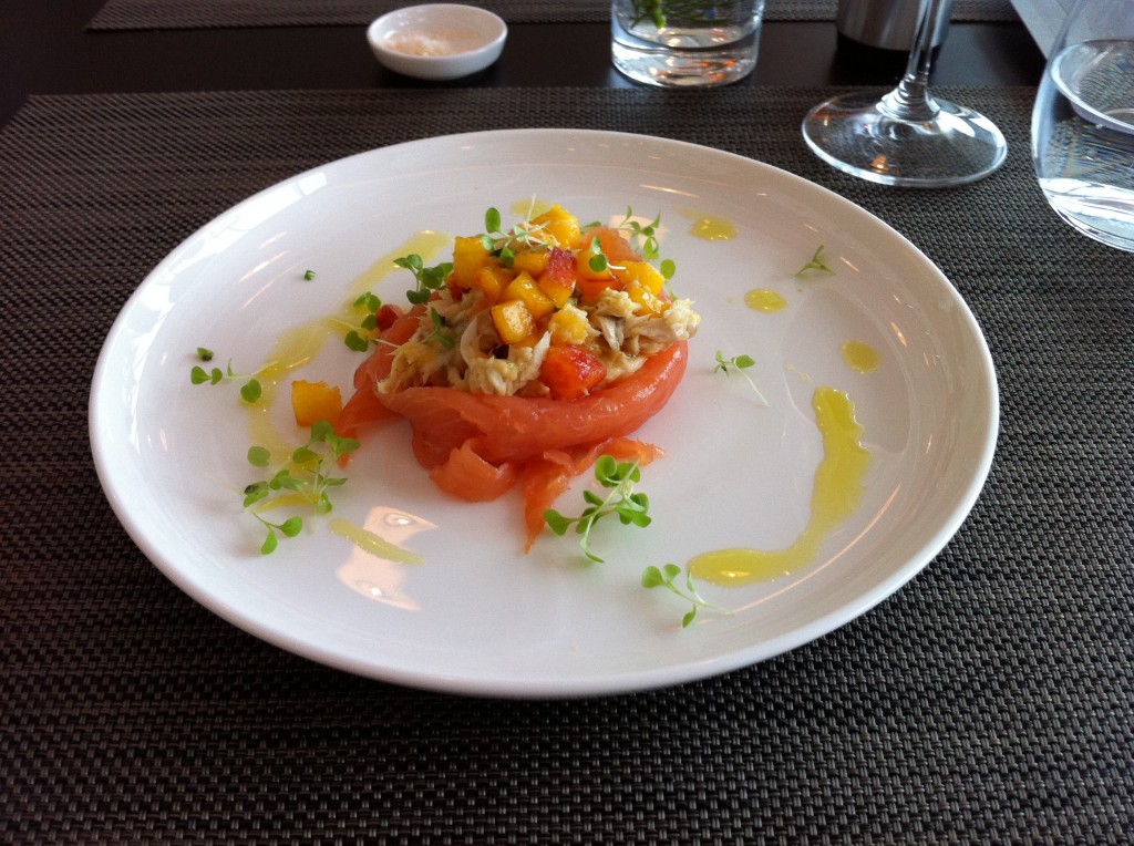 The entree that I selected was the special. A salad of smoked salmon, tuna and mango. This was accompanied by champagne.All of the meals were fantastic as usual.