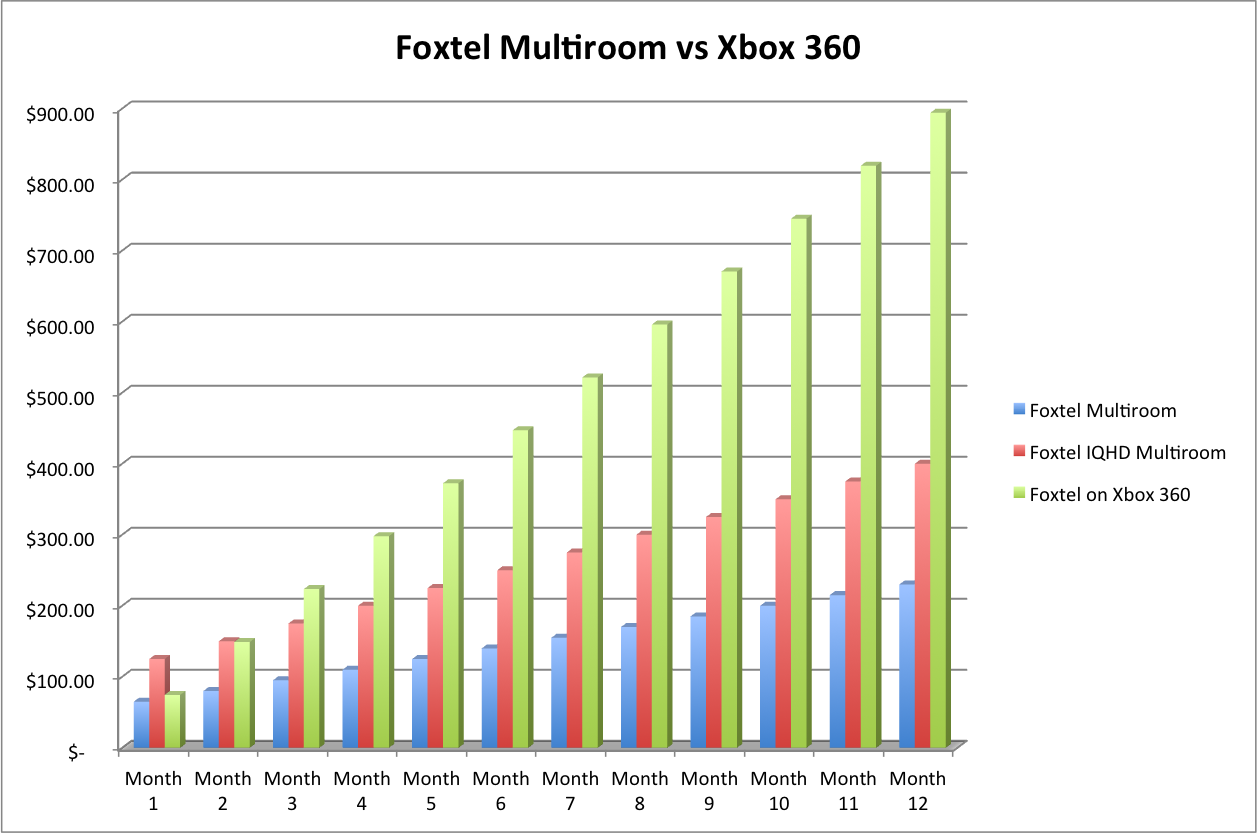This confirms my original thoughts, and makes the Foxtel on Xbox 360 service unviable for existing Foxtel customers. Over a 12 month period, excluding bandwidth, it would cost me a premium of more than $600 to use the Foxtel on Xbox 360 service rather than simply connecting a Foxtel multiroom service: